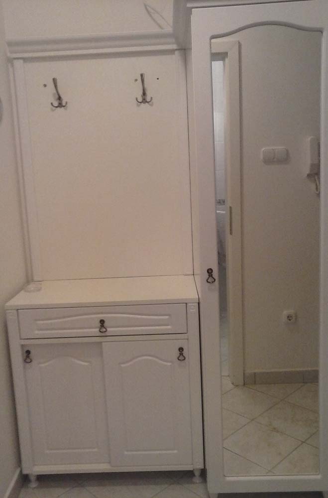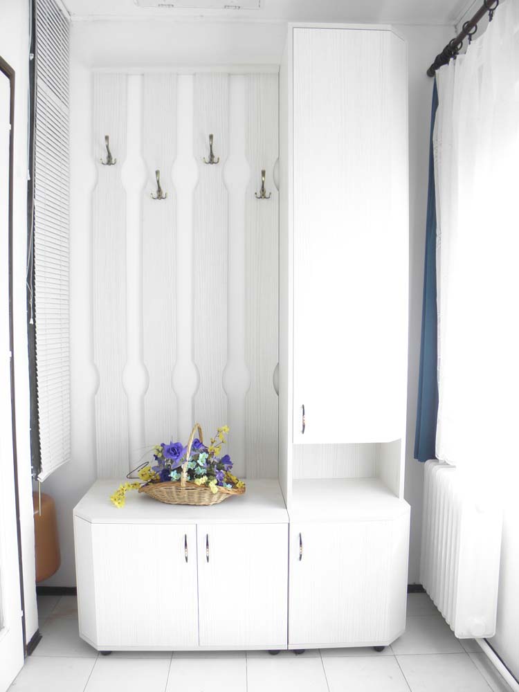 Az ajtókon a függőleges fémmerevítők egyben fogantyúként is szolgálnak, a matt króm és nikkel színek nagyon jól mutatnak. Ezen a helyen általában nincs ablak, ezért itt javasolt a világos színek alkalmazása. Minél több cipő tárolására alkalmas legyen, sok polccal, és természetesen a kabátok számára is legyen elegendő hely.